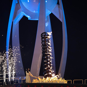 В завершение всего праздника был зажжен олимпийский огонь. Эту почетную миссию исполнила фигуристка, олимпийская чемпионка 2010 года в Ванкувере Ен А Ким. Главный символ Игр-2018 в импровизированной чаше факела, изготовленного по макету известного корейского дизайнера Ким Ён Се, совершил большой путь длиной в три с половиной месяца. Олимпийский огонь доставлен из Греции на корейский полуостров, где был зажжен за 100 дней до начала Игр-2018. Заветный факел пронесли 7500 добровольцев по девяти южнокорейским провинциям и восьми крупным городам. Общий маршрут эстафеты составил символичные 2018 км.